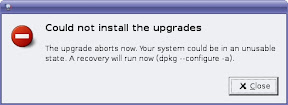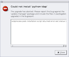 # remove the python-ldap package. # $sudo dpkg -r python-ldap # rescue the crashed upgrade. # $ sudo dpkg --configure -a # finally ensure that I got all the updates with one of the following # commands. # $ sudo aptitude dist-upgrade $ apt-get dist-upgradeReboot and enjoy your new x84_64 Ubuntu Feisty machine! ;-)